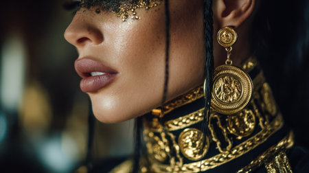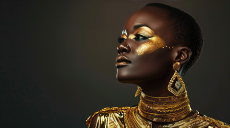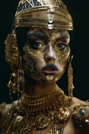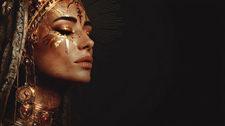 Captivating portrait of a woman adorned with golden accessories and striking makeup. This artistic image captures beauty and elegance against a dark background.