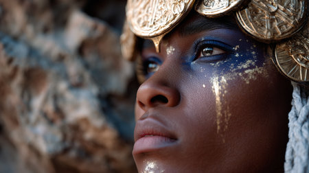 Egyptian Beauty: Woman with Blue Makeup and Gold Accessories. Afrofuturist Priestess: Contrasting Glow and Gem-Encrusted Adornments.