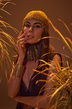 Portrait of brunette woman in egyptian look looking at camera near plants on brown background