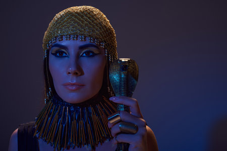 Woman in egyptian headdress and makeup holding crook in snake shape on blue light on brown