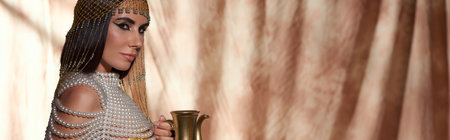 Elegant woman in egyptian headdress and pearl top holding golden jug on abstract background, banner