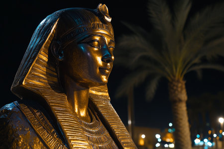 Illuminated bronze statue of an Egyptian woman in a city square at night surrounded by screens