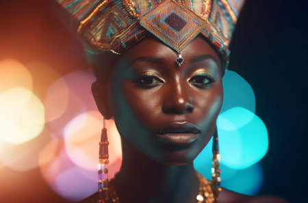 African woman diamond headwear shot. Blured colorful background lights with natural female beauty. Generate Ai