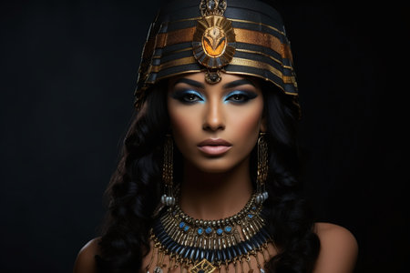 an egyptian woman wearing an elegant egyptian dress stands gracefully against a black background. the photo showcases a captivating blend of dark azure and bronze tones, creating a mesmerizing atmosphere. with its 8k resolution, the image beautifully captures the intricate details of the organic sculpting on the dress. this historical scene exudes a sense of regality and is reminiscent of ancient egypt's rich culture and