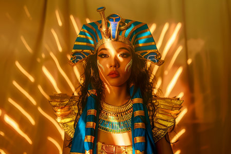 Majestic Woman in Traditional Egyptian Pharaoh Costume with Headdress and Makeup in Golden Illuminated Setting AI Generative