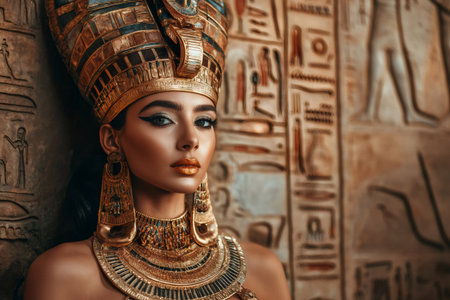 Elegant queen wearing golden crown, collar, and earrings, posing against an ancient hieroglyphic wall