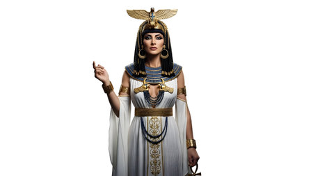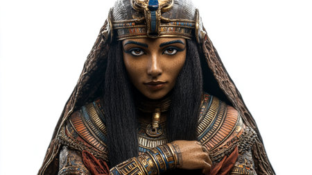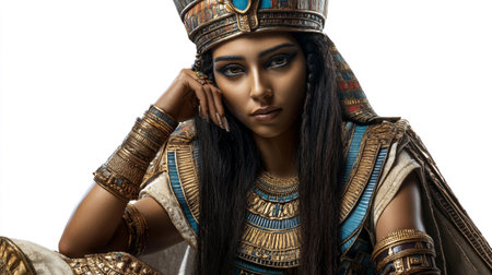Queen Cleopatra full body portrait in ancient Egyptian royal attire, isolated on white background for history and culture concepts. High quality photo