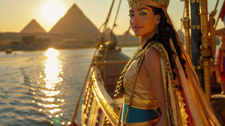 Cleopatra, Queen of Egypt, Legendary ruler known for her intelligence and beauty, standing on the deck of her royal barge on the Nile, with pyramids in the background, realistic, Sunlight, Chromatic Aberration, Macro shot