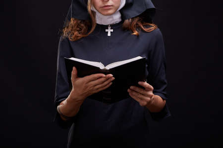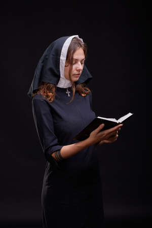 Nun in religion black suit holds Bible and posing on camera with big book on a black background. Close-up. Religion concept.
