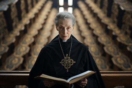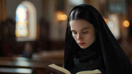 A peaceful caucasian nun, dressed in black, prays in a dimly lit church. Her eyes shut in contemplation as she reads, embodying religious devotion.