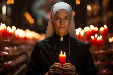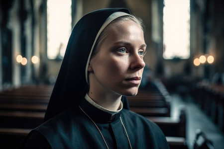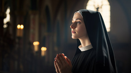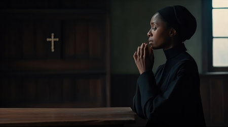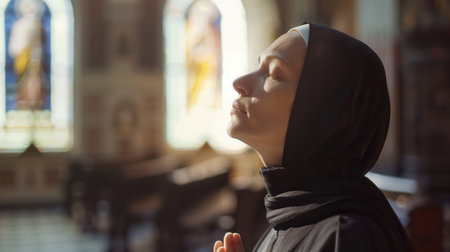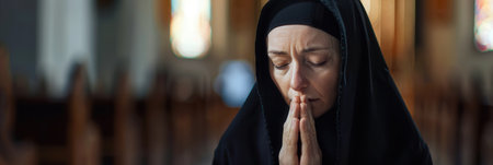 A serene Caucasian nun in a black habit deep in prayer inside a church, creating a devout portrait.
