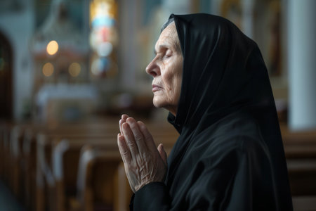 A caucasian nun in a black habit prays devoutly inside a church. The image captures a moment of peaceful reflection.