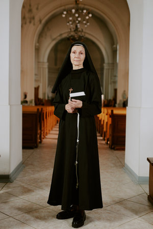 Vertical long shot of mature Caucasian nun holding Bible book in hands standing at narthex in Catholic church, looking at camera
