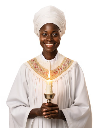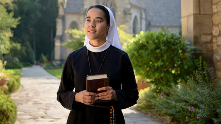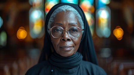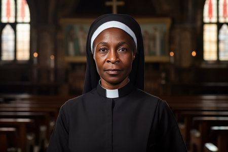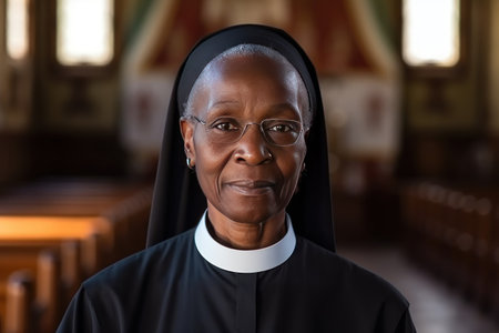 Mature Catholic nun: African American woman in apostolic standing, quietly smiling sweetly and looking at camera. Catholic nun preparing to serve God in church smiling and rejoicing at opportunity to be useful to people