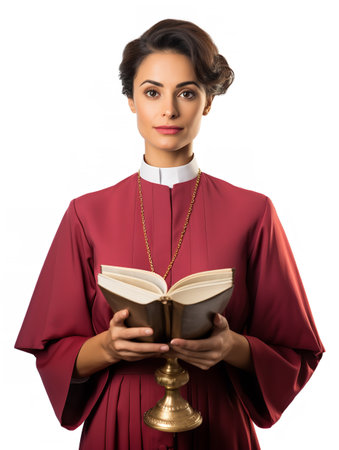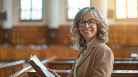 Vertical medium portrait of mature Caucasian nun holding Bible book standing in Catholic church and looking at camera