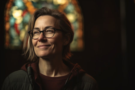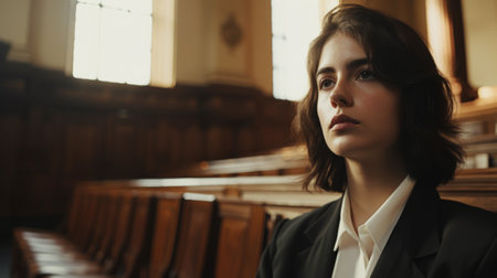 A young woman with brown hair sits in a church, surrounded by wooden pews. She gazes forward with a thoughtful expression. The light from the windows fills the space.