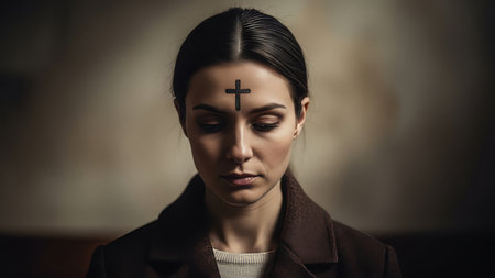 Woman with ash cross on forehead, solemn, religious, church, indoors.