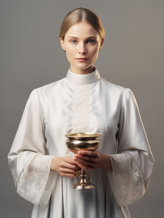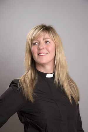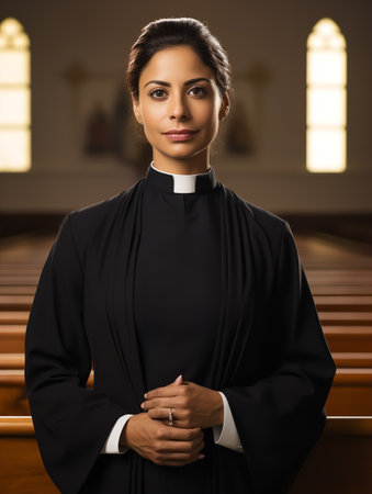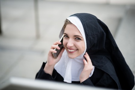Young Catholic nun - woman in apostolic standing with folded hands quietly smiling sweetly. Catholic nun preparing to serve God in church smiling and rejoicing at opportunity to be useful to people