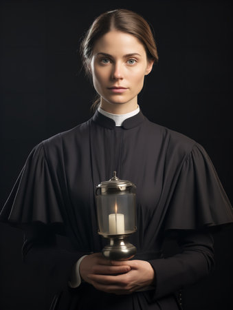 A portrait of a serene nun, dressed in a black habit, deeply engrossed in prayer inside a church.