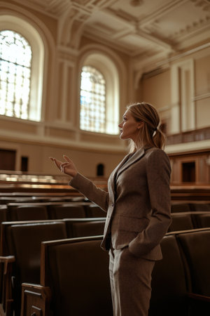A woman lawyer stands in a well lit courtroom using hand gestures to emphasize her point. Her confident expression shows determination as she engages with the audience.