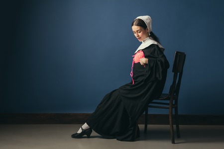 Dont be scare to try on modernity. Medieval young woman in black vintage clothing as a nun sitting on the chair on dark blue background. Trying on new bright pink bra. Concept of comparison of eras.
