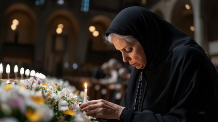 A woman in a black head scarf lights a candle. The scene is set in a church, and the woman is praying. The candle is lit in front of a vase of flowers, which adds a sense of serenity
