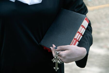 Close up of a ghost nun or demon in the mysterious holding the Bible.