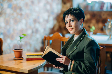 Beautiful young nun in religion black suit holds Bible and posing on camera with big book on a black background. Religion concept.