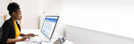 Young Businesswoman Filling Online Survey Form On Computer At Desk