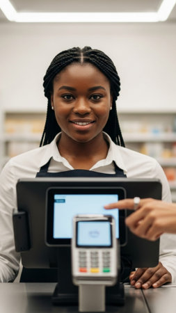 Shop cashier or seller working in trendy boutique, standing at desk with cash register and looking away. Medium shot. Retail store or job concept