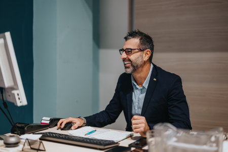male manager near the desktop office computer technologies