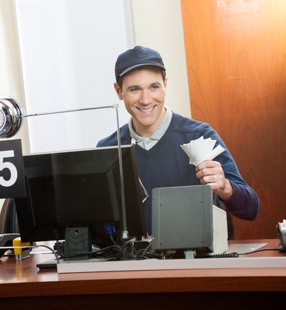 Happy Worker Holding Tickets At Box Office
