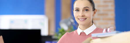 A young smiling businesswoman is sitting in front of several files at the desk in the office. A shelf is standing in the background. The woman is looking to the camera.