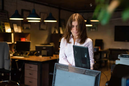 Attractive woman office worker holding large heavy folders with documents on background of office workspace