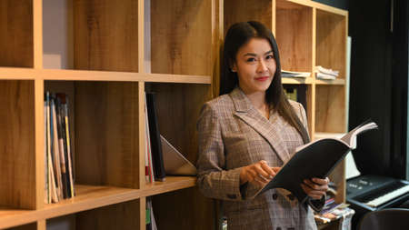 Attractive asian female manger standing near bookshelves in bright company office.