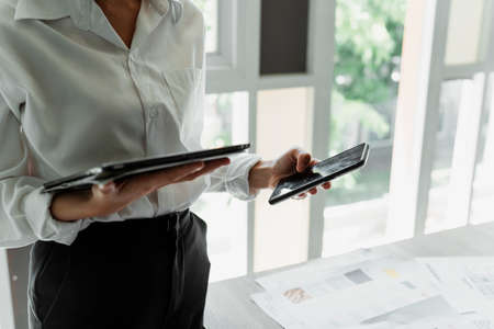 Cropped image of tablet and smartphone in woman's hands while she use it for work.