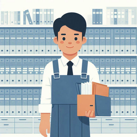 Cartoon office worker with folders in his hands. Vector illustration.