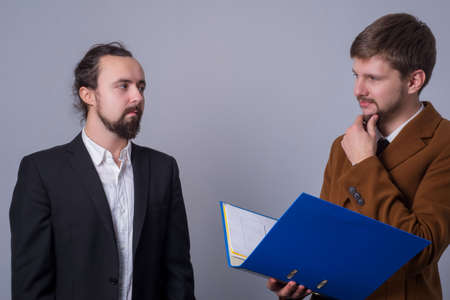 Portrait of two young business people in suits. The boss with a folder with documents in his hands critically looks at his subordinate.