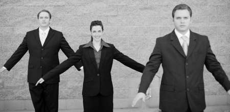 Businesspeople wearing suits and standing together with their arms raised from their sides