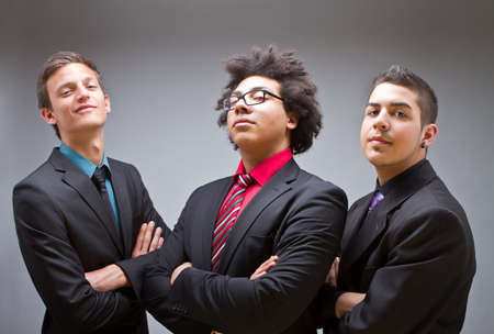 Three young businessman posing at the camera. Trendy and Cool.