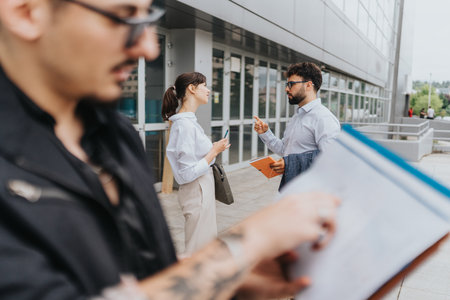Businesspeople discussing plans outside a modern building in daytime
