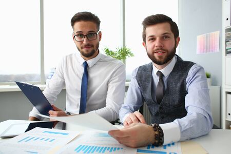 Two handsome stylish men in shirts and ties looking at camera and smiling while sitting at the table with documents