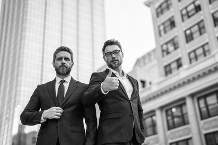 Business success men outdoor. Two businessmen on business successful meeting in city. Successful partnership. Men on city street outdoor. Business strategy. Business teams success.