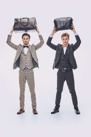 Full length portrait of two elegant young men in classic three-piece suits holding over themselves leather bags on a white background. Men's fashion and accessories.