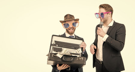 Welcome sponsor. Showman interview sponsor with money suitcase. Financial donor. Sponsoring company