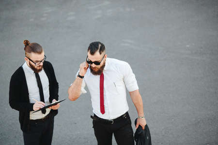 Two bearded businessman working on the street