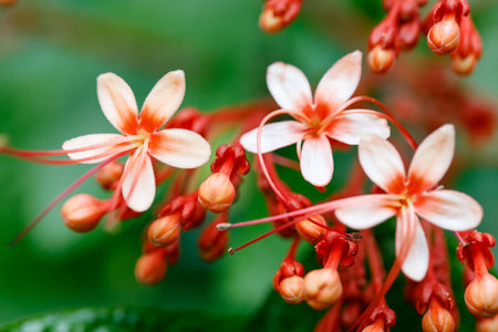 Closeup of Pagoda Flower Clerodendrum paniculatum tropical flowers with soft peach petals and red stamens in natural floral background