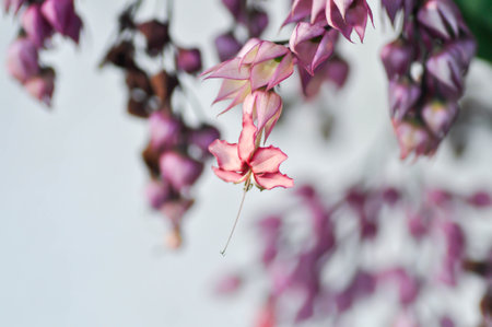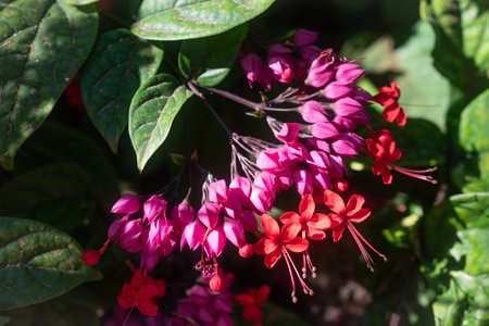 Pink flowers of clerodendrum thomsoniae bleeding glory-bower blossoming plant close up