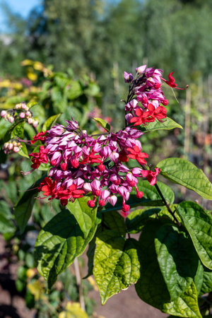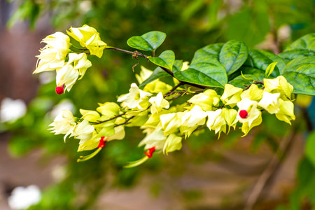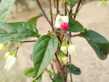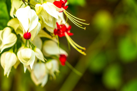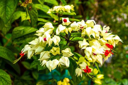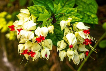 blooming bagflower or clerodendrum thomsoniae white and red flower green leaves tree