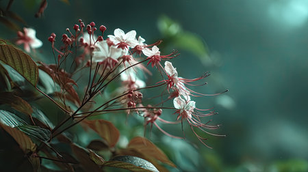 A detailed photograph of a single Clerodendrum, swaying gently in the wind, captured in natural daylight. Fresh and airy atmosphere, soft motion blur on leaves, crisp details on textures, background softly blurred into natural greenery, cinematic natural light, realistic photography style.